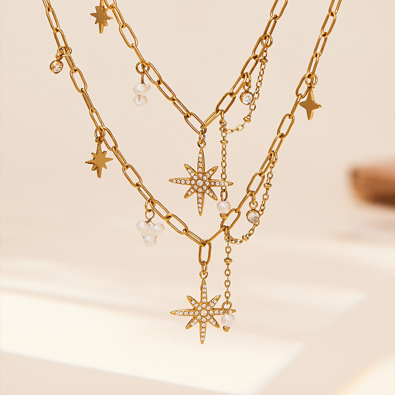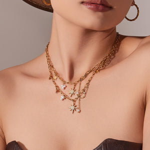 Close-up of layered gold necklaces with star and pearl charms on a woman's neck wearing a brown textured strapless top